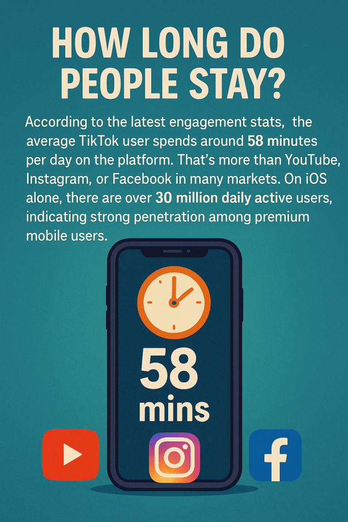 According to the latest engagement stats, the average TikTok user spends around 58 minutes per day on the platform. That’s more than YouTube, Instagram, or Facebook in many markets. On iOS alone, there are over 30 million daily active users, indicating strong penetration among premium mobile users.