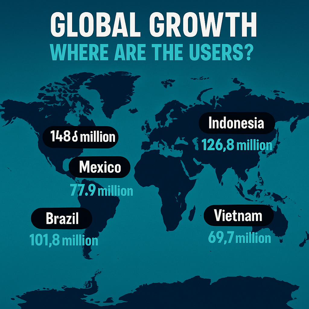 The United States continues to be one of TikTok’s powerhouses, with around 148 million users. Indonesia follows closely with 126.8 million, while Brazil contributes about 101.8 million. In Latin America, Mexico has surged to 77.9 million users, and Vietnam tops Southeast Asia with 69.7 million. Together, these five countries account for a massive share of the global audience.