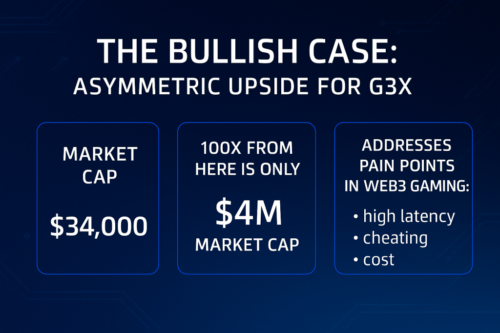 G3X may be one of the most overlooked asymmetric bets in the current Web3 market. With a market cap of just $34,000, even a modest rise could lead to outsized returns. A 100x move from here would only require a $4 million market cap, which is still considered microcap territory in the crypto world. For comparison, meme coins with no real utility have reached valuations well above this threshold.