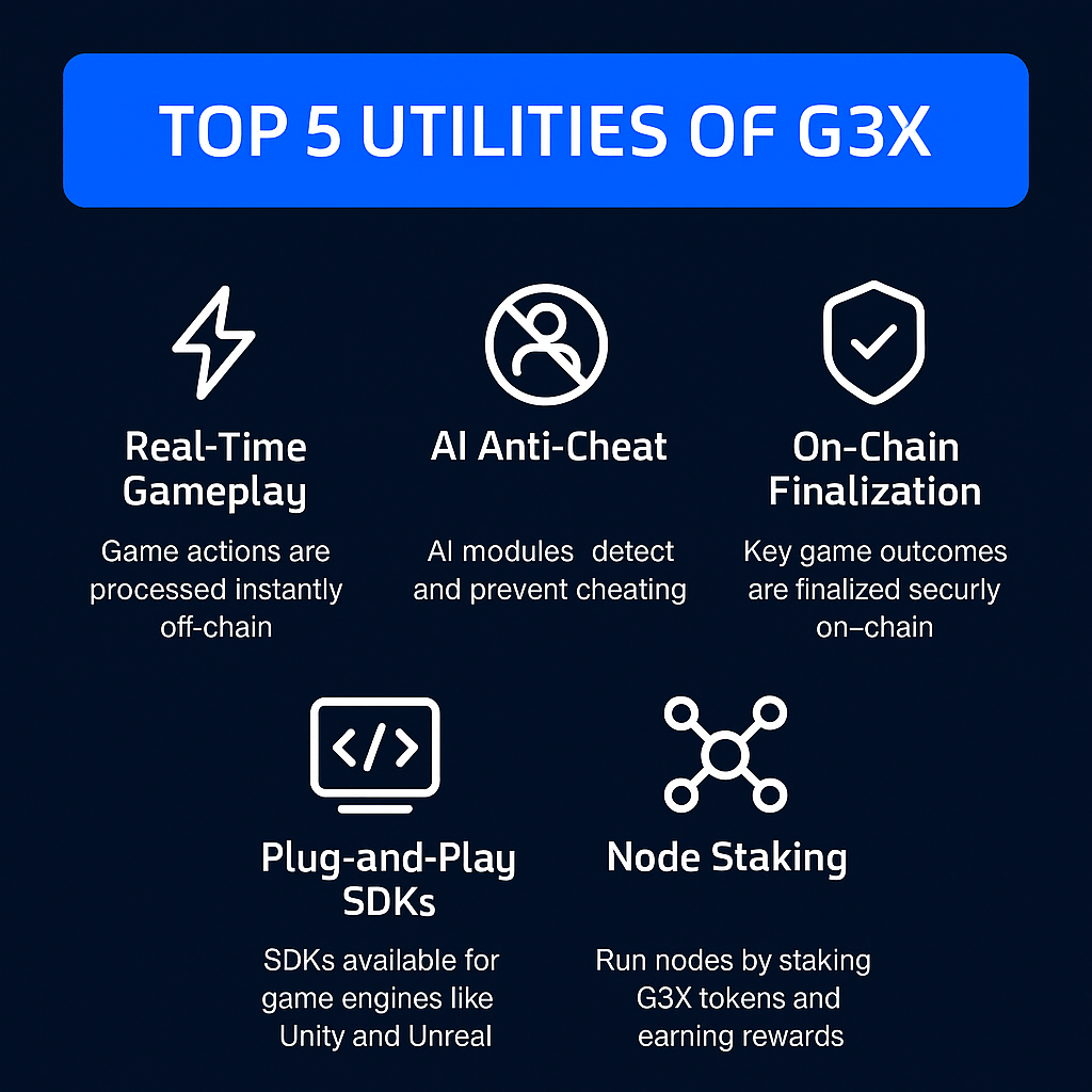 G3X introduces a powerful set of utilities tailored for the next generation of Web3 gaming infrastructure. Its real-time gameplay engine allows game actions to be processed instantly off-chain, eliminating lag while maintaining a seamless experience. The AI anti-cheat system stands out by automatically detecting and preventing unfair behavior—crucial for sustaining player trust in competitive environments. With on-chain finalization, only critical outcomes like rewards and NFTs are recorded on-chain, balancing cost-efficiency with transparency. Developers benefit from plug-and-play SDKs compatible with Unity and Unreal, enabling quick integration without deep blockchain expertise. Finally, G3X’s node staking model lets participants earn rewards by validating gameplay and maintaining network performance. These combined utilities position G3X as a modular, scalable, and developer-friendly solution with real-world gaming applications.