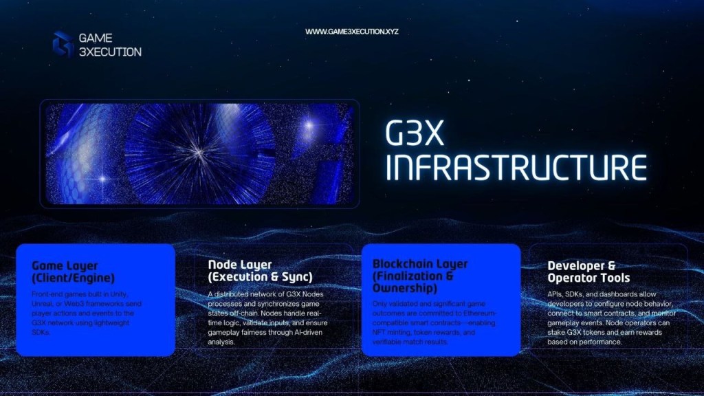 Game3Xecution, or G3X, presents itself as a decentralized infrastructure layer tailored for Web3 games. Unlike traditional blockchain-based games that struggle with latency and high gas fees, G3X processes game actions off-chain via a decentralized node network—ensuring low-lag performance. Then, it finalizes critical actions like rewards or match results on-chain, preserving the core benefits of blockchain transparency.