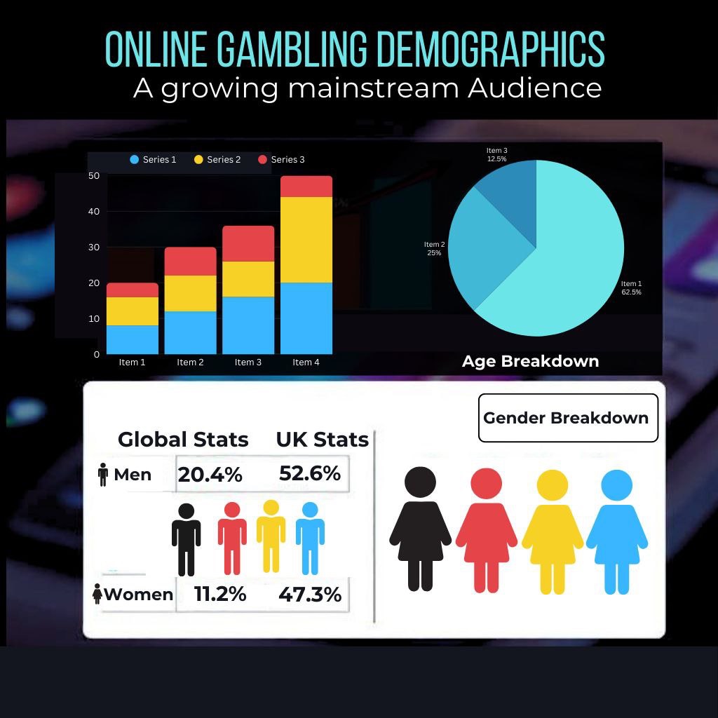 Globally, about 20.4% of men and 11.2% of women gamble online. In the UK, the gap is closing: 52.6% male, 47.3% female.