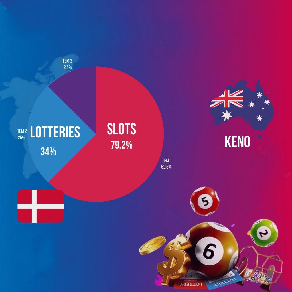 Slots dominate revenue, accounting for nearly 79.7% of total online gambling earnings. Lotteries hold a strong position, especially in regions like Denmark, where they make up 34% of the gambling market. Keno remains popular in Australia and select Asian markets, often tied to local pubs or mobile apps.